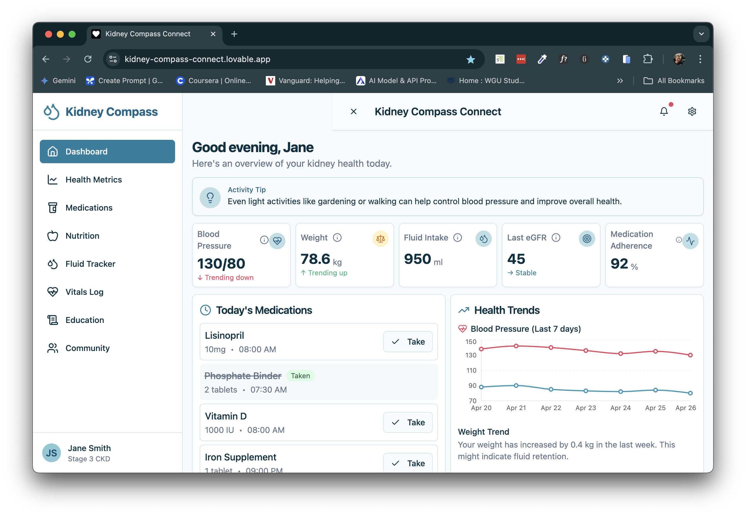 This Lovable App prototype radiates a calm, professional vibe through its clean, card‑based layout, muted blue accents, and friendly iconography. It balances clarity and warmth—making complex kidney health metrics feel approachable and easy to navigate.